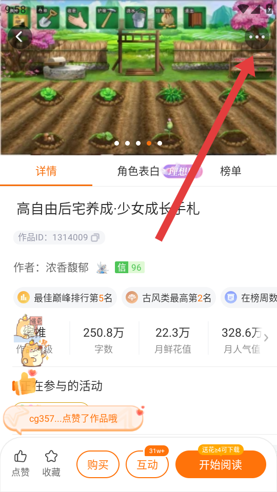1、进入橙光作品详情页后,点击右上角的三点按钮,这是触发分享操作的入口,点击后会弹出功能选项。