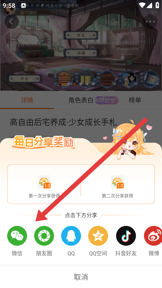 3、在每日分享奖励弹窗中,选择任意分享渠道如微信、朋友圈等完成分享,即可获得野花奖励。