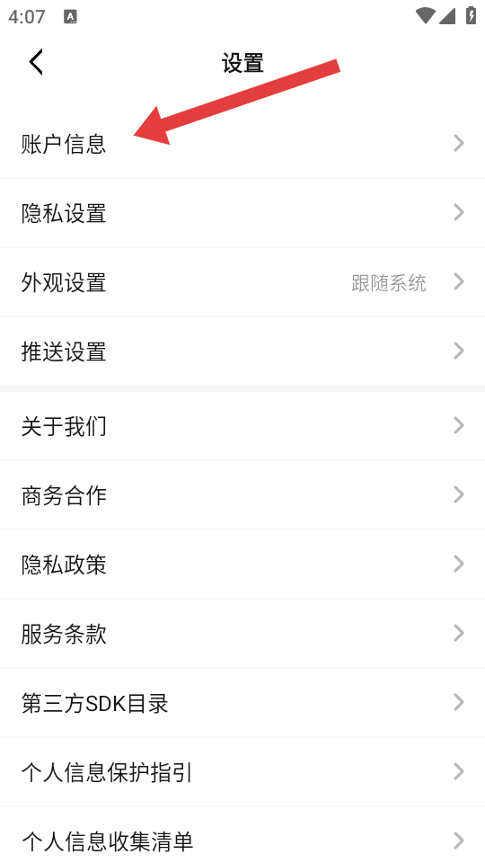 2、在设置界面点击账户信息,进入账户信息页面以进行手机号换绑操作。