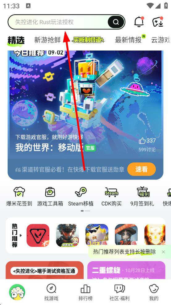 1、打开好游快爆APP,点击首页顶部的搜索栏。