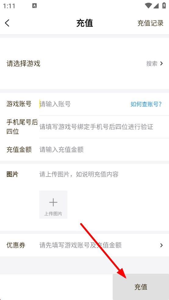 3、进入游戏充值界面,依次填写游戏账号、手机尾号后四位、充值金额 等信息,确认信息无误后,点击充值按钮完成充值操作。