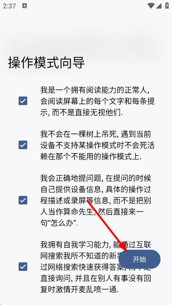 3、进入操作模式向导界面,勾选所有内容后,点击开始按钮,按照后续引导完成授权及相关操作。