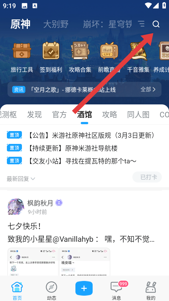 1、打开米游社APP,进入首页后需要点击右上角搜索的图标,进入搜索的界面。
