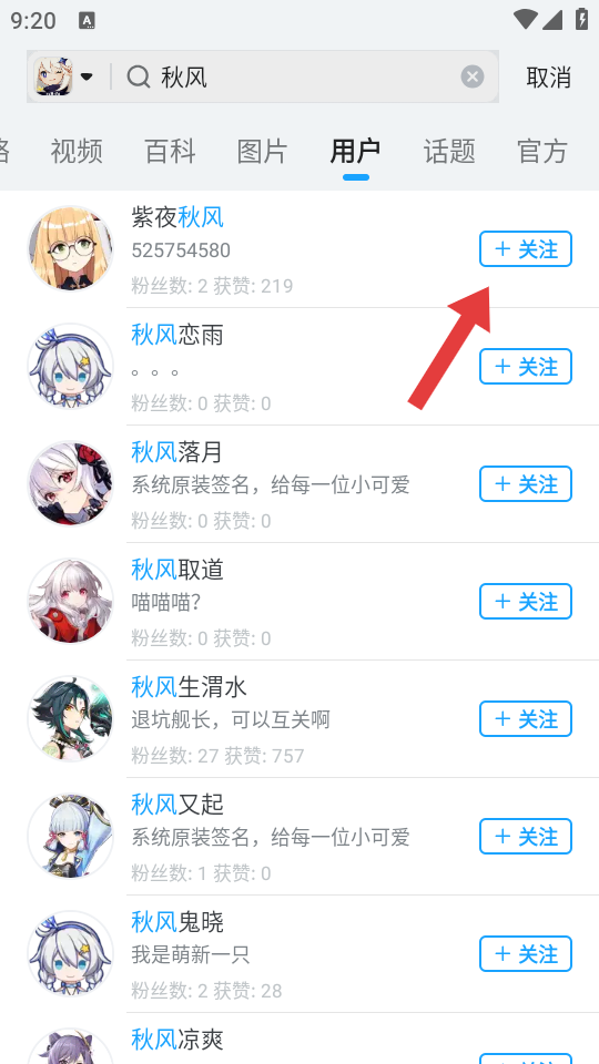 3、在搜索结果的用户标签页中,找到目标好友账号,点击其右侧蓝色的+关注按钮,发送好友关注添加的请求。