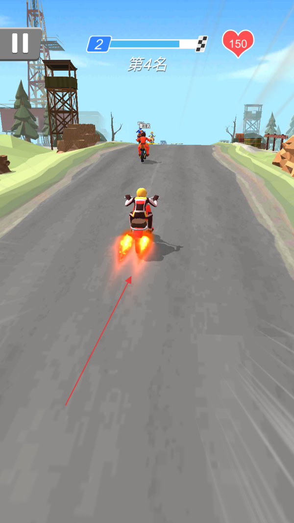 1、竞速技巧掌控:通过预判赛道起伏与机关位置,精准控制摩托起跳时机与空中姿态,利用地形实现弯道超车或避开敌方攻势。