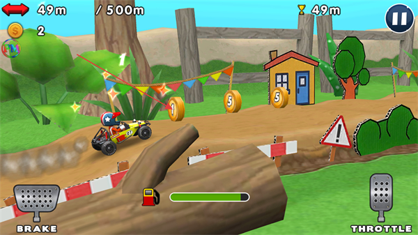 2、操控赛车越过障碍,收集沿途金币,提升行驶距离与金币数量。