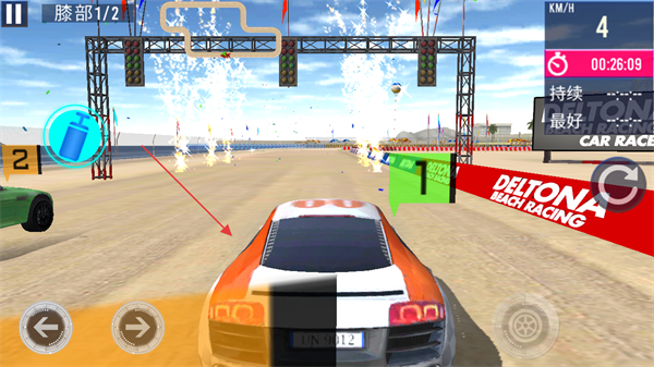 1、通过左右箭头控制赛车在海滩赛道行驶,穿过拱门,注意左侧车辆,提升车速。