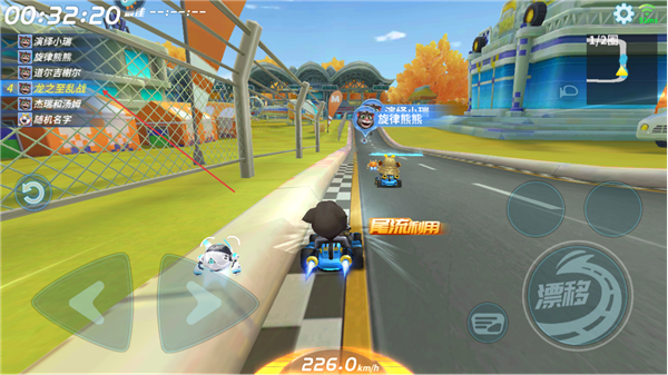 3、在赛道中点击漂移键完成漂移,积累加速能量提升车速,同时按提示完成操作,保持领先节奏。