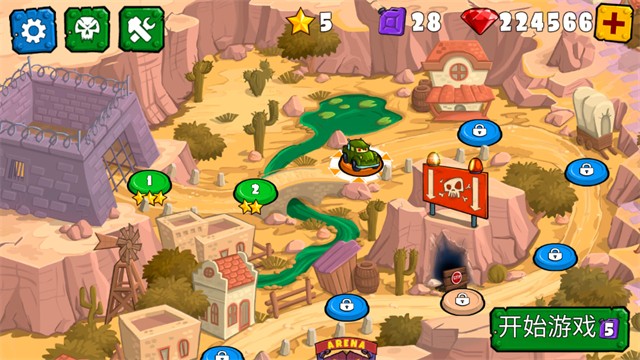 2、车辆改装与升级:通过闯关赢得水晶与零件,进入车库解锁心仪汽车,在升级界面强化速度、弹药等属性,零件创造独特赛车,内置功能道具增强战斗能力。