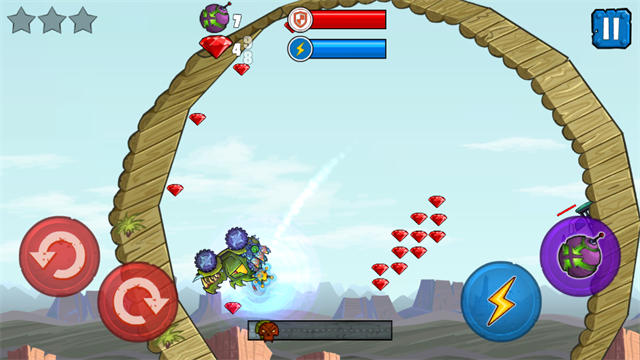 1、核心操作与闯关流程:进入关卡后,左手控制赛车旋转调整重心适应上下坡,右手点击加速键提升车速,遇敌人时释放炸弹摧毁目标,躲避障碍并吞噬车辆。