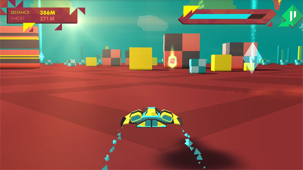 1、操控几何飞船在彩色场景中飞行,躲避紫色、彩色方块等障碍物,不断推进距离如从51M到151M。