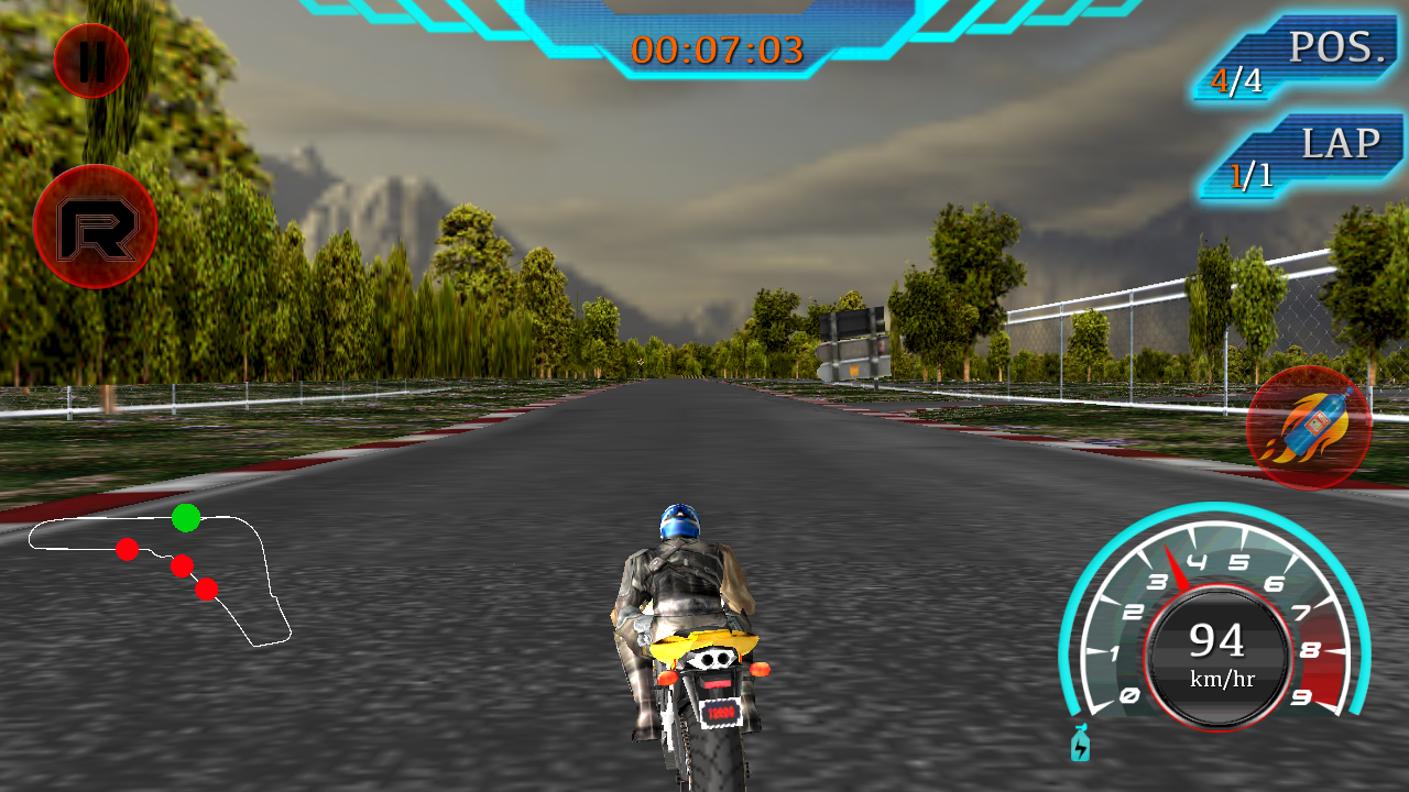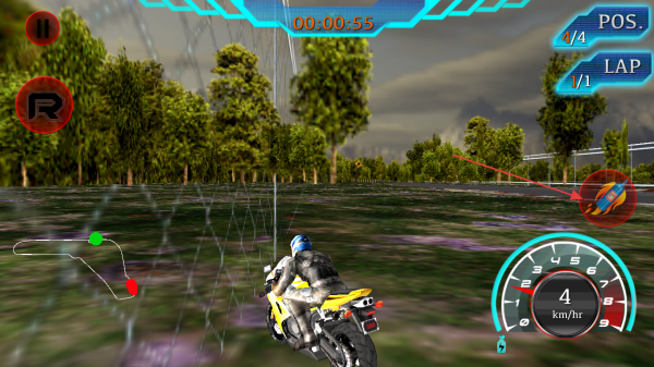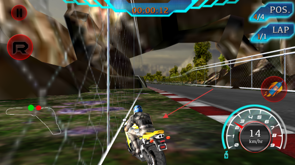 1、进入游戏,留意屏幕上方显示的时间00:00:12、排名POS.1/4和圈数LAP1/1,操控摩托车起步,通过左侧虚拟按键控制方向。