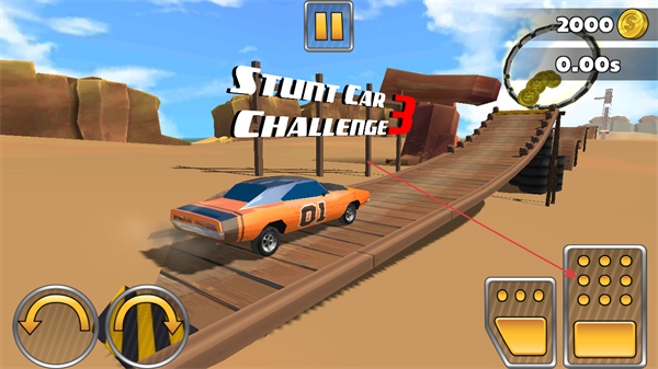 1、操控赛车在沙漠特技赛道行驶,利用右侧按键控制赛车加速、特技动作,冲上坡道收集金币。