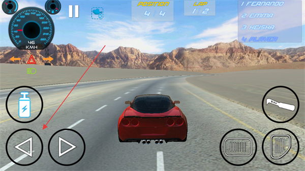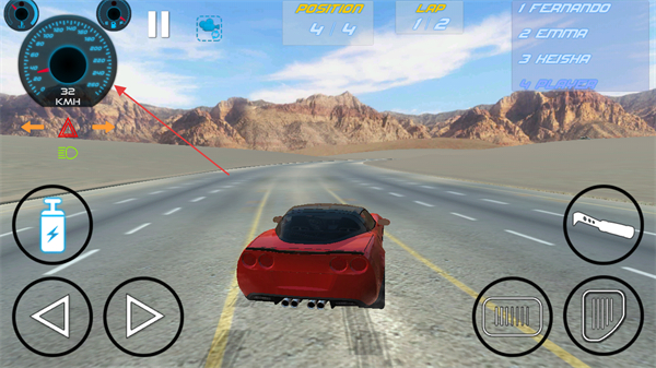2、点击右侧油门按键加速,通过方向盘和左右方向键调整跑车行驶方向,超越对手。
