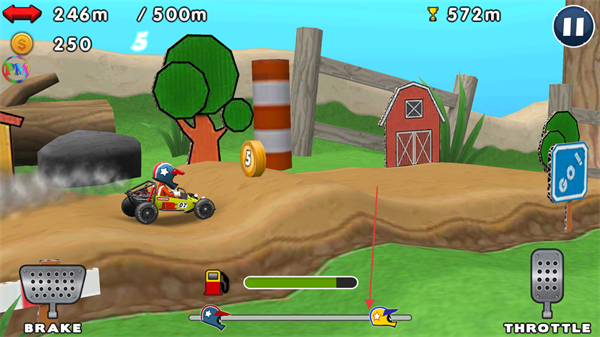 1、操控赛车超越对手,同时收集金币,保持向500m目标推进。