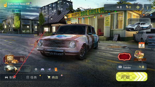 1、在俄罗斯乡村赛车手主界面,点击车辆进入车辆选择界面,也可点击开始进入模式选择环节,同时可借助界面功能按钮辅助操作。