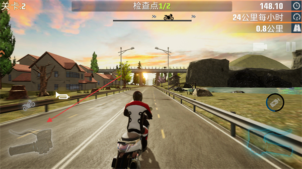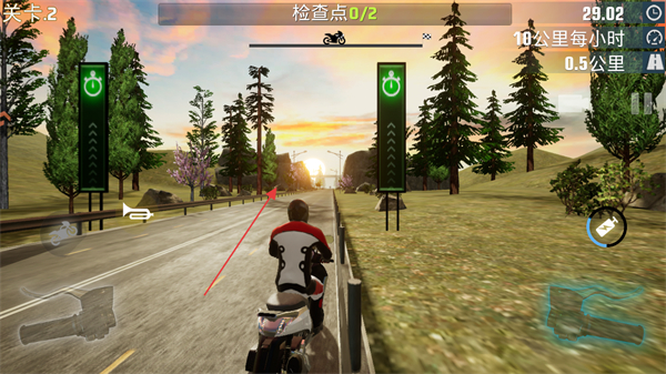 2、操控摩托沿道路行驶,依次通过绿色的检查点装置,积累检查点进度。