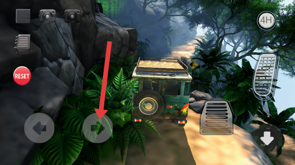 1、驾驶越野车时,通过右侧的油门踏板按键控制车辆前进动力,使其在崎岖的越野路径上行驶。