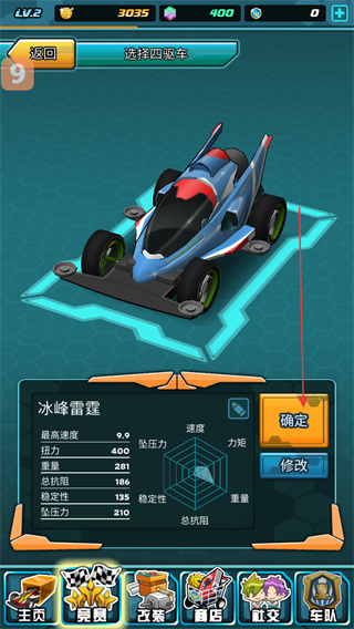 2、在选择四驱车界面,选定冰峰雷霆后查看其属性,点击确定按钮确认选择,进入后续的比赛准备流程。