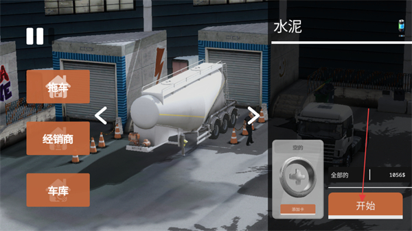 1、此界面包含拖车、经销商、车库功能选项,,右侧显示运输货物为水泥,点击开始按钮即可启动本次水泥运输任务。