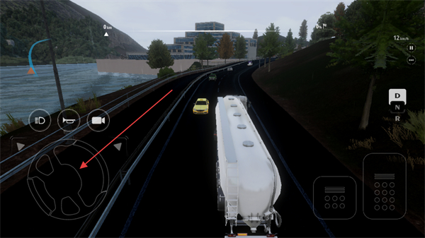 2、在驾驶界面中,通过方向盘控件操控车辆的行驶方向,选择D档保持车辆前进状态,保障运输过程的安全顺畅。