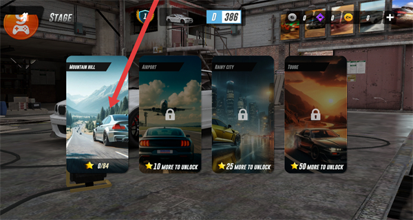 2、在赛道选择界面,点击已解锁的MOUNTAIN HILL赛道,进入该赛道的驾驶场景。