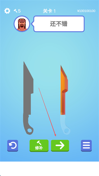 4、打磨完成后,若获得还不错的评价,可点击箭头按钮进入下一关,或选择修补进一步优化。