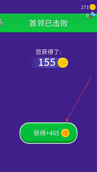 4、击败首领后,点击获得+465按钮,领取通关奖励金币。