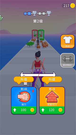 1、在第2级界面,消耗金币升级推力等属性,增强角色能力。