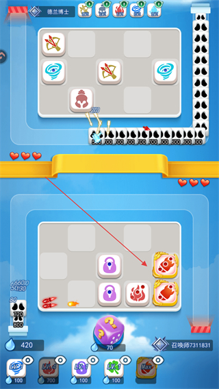 1、合并升级己方元素如火焰,使其攻击敌方格子,削减敌方血量。