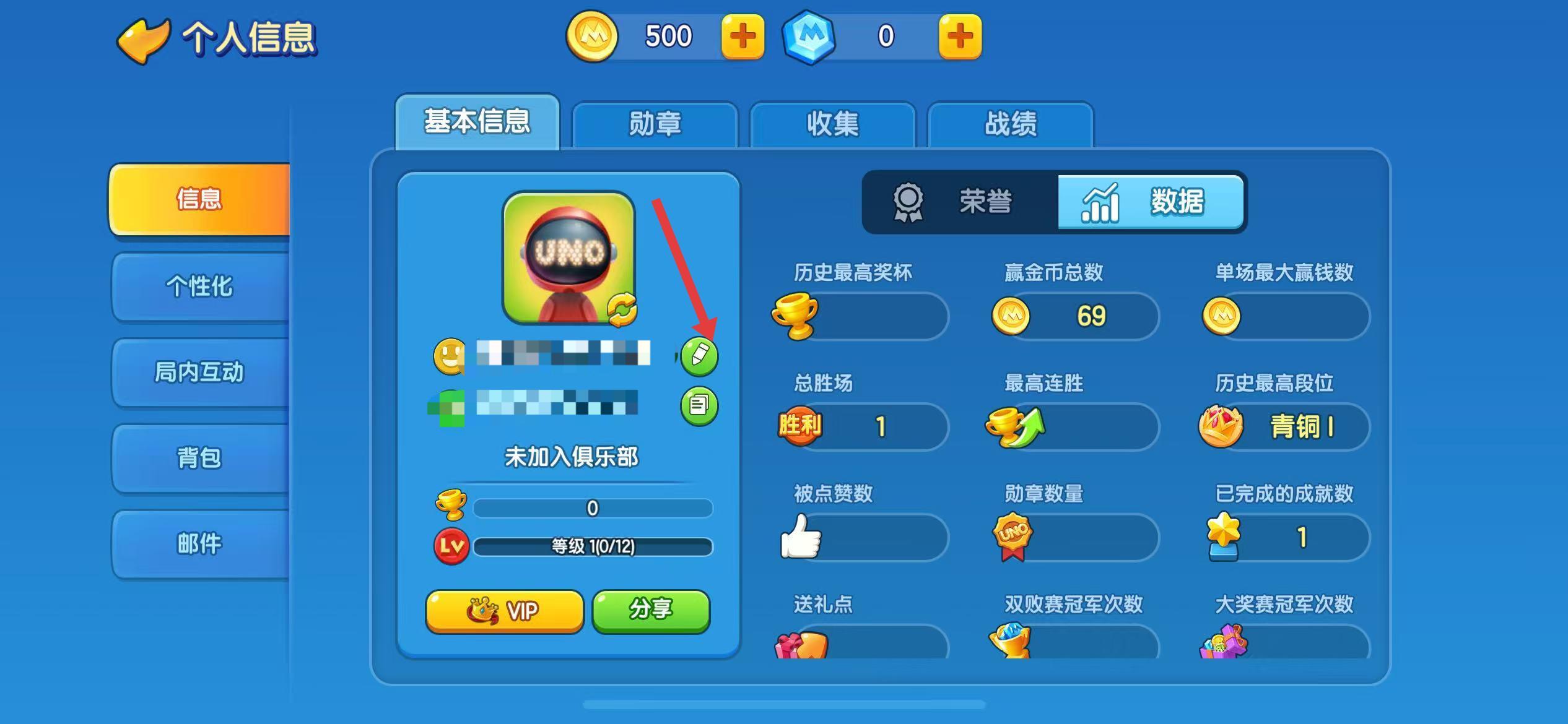 1、在游戏主界面,点击左上角头像图标,进入个人信息页。