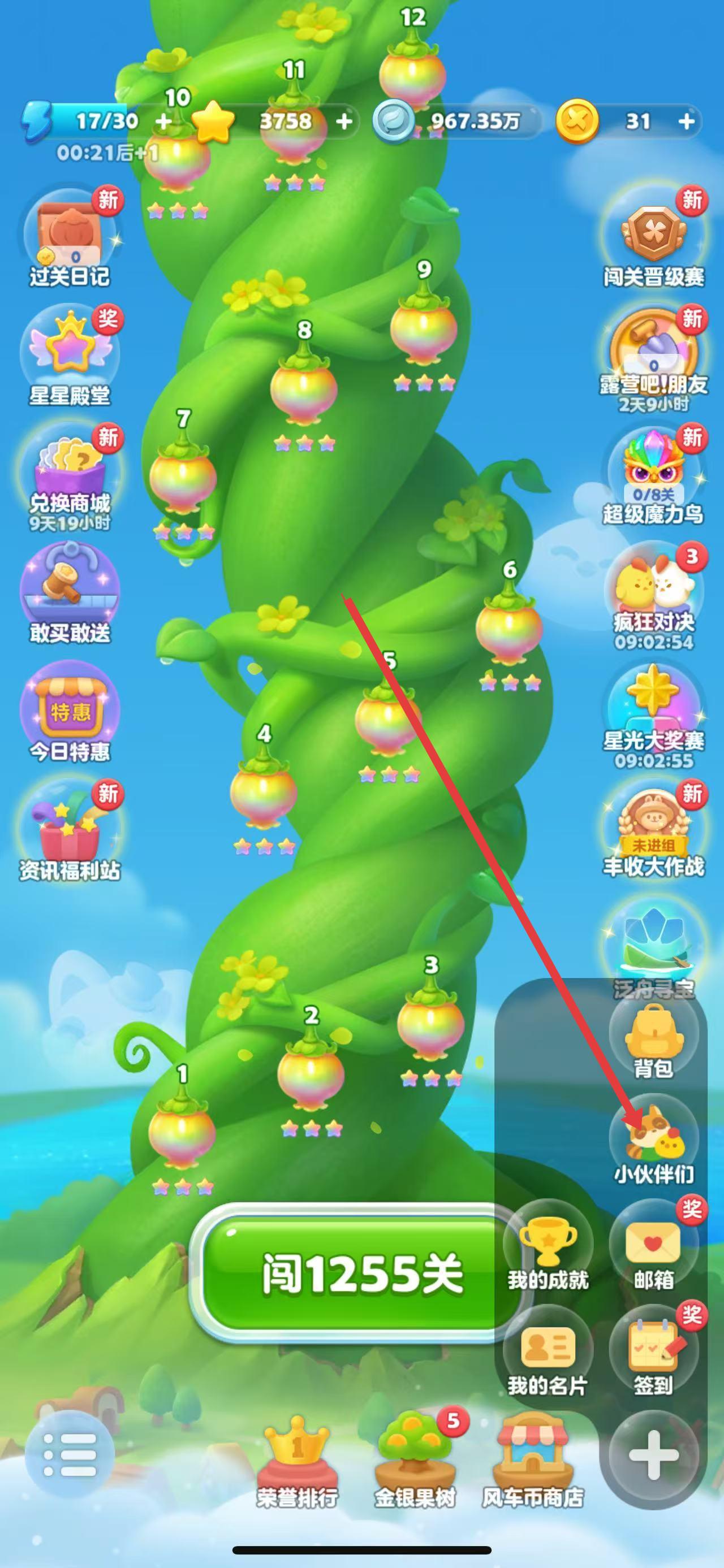 3、在小伙伴们界面,点击我的伙伴,就能看到好友们的关卡进度、星星数量等信息,以此知晓好友排名情况句号。