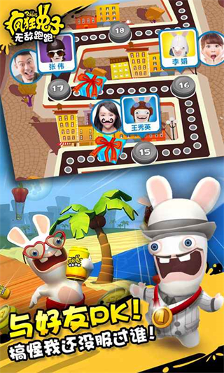 采用鲜明卡通画风,兔子形象搞笑可爱,游戏界面制作精良、色彩鲜艳,跑酷过程中的动作特效与场景切换流畅自然,带来愉悦的视觉体验与欢乐氛围。