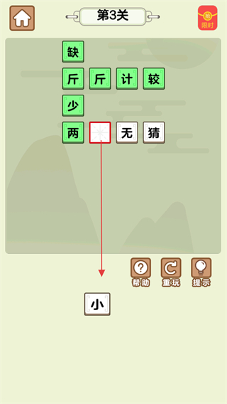 1、查看第3关界面,取下方计填入空格,组成斤斤计较。