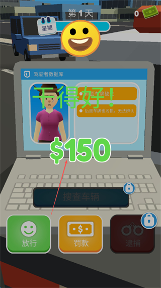 4、罚款后会获得奖励如$150,并显示干得好!,继续执行执法任务。