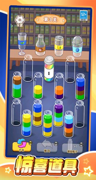 2、若排序思路混乱,可点击打乱按钮重置瓶子布局,重新规划液体的归类顺序,推进关卡进程。