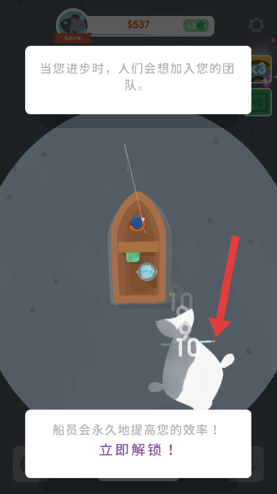 3、属性强化与钓场进阶联动:初期可强化多种能力属性,如提升钓起鱼类的金额、增加鱼群靠近概率、加快自动钓鱼速度;积累足够金币升级钓场后。