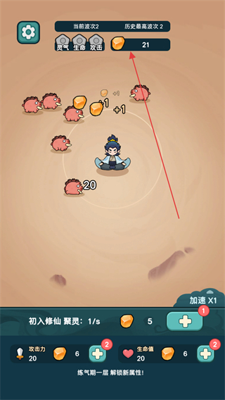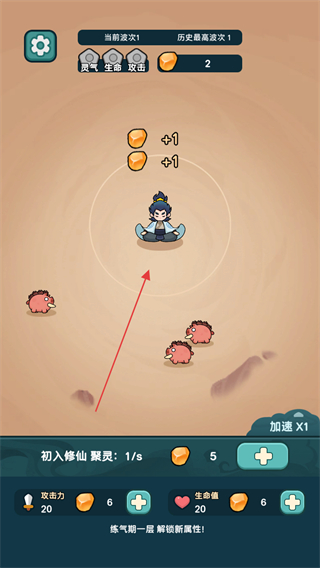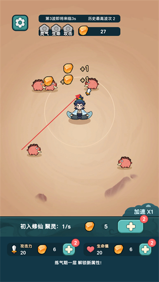 1、操控修仙角色自动攻击周围妖怪,收集橙色道具提升属性+1,积累灵气推进游戏。