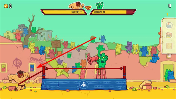 2、飞行中撞击软糖熊可获取金币与增益效果,助力飞得更远更快,点击屏幕让野牛撞击软糖熊可获得加速。
