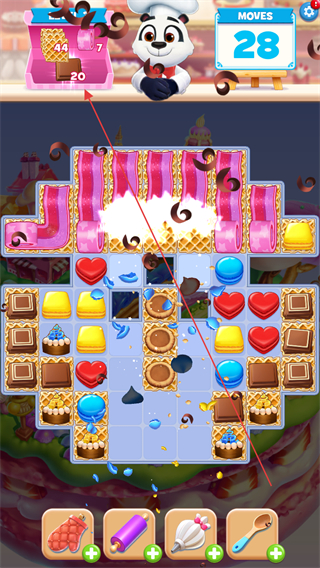3、消除饼干后,MOVES变为28,左上角道具数量更新,继续推进消除进度。