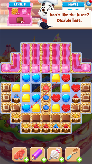 2、在LEVEL2中,按提示拖动相同图案饼干消除,注意MOVES步数,积累目标道具。