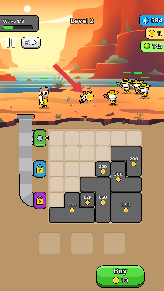 2、点击Buy按钮消耗10金币,提升己方战力或解锁新的攻击方式,助力抵御敌方波次攻击,同时积累更多金币。