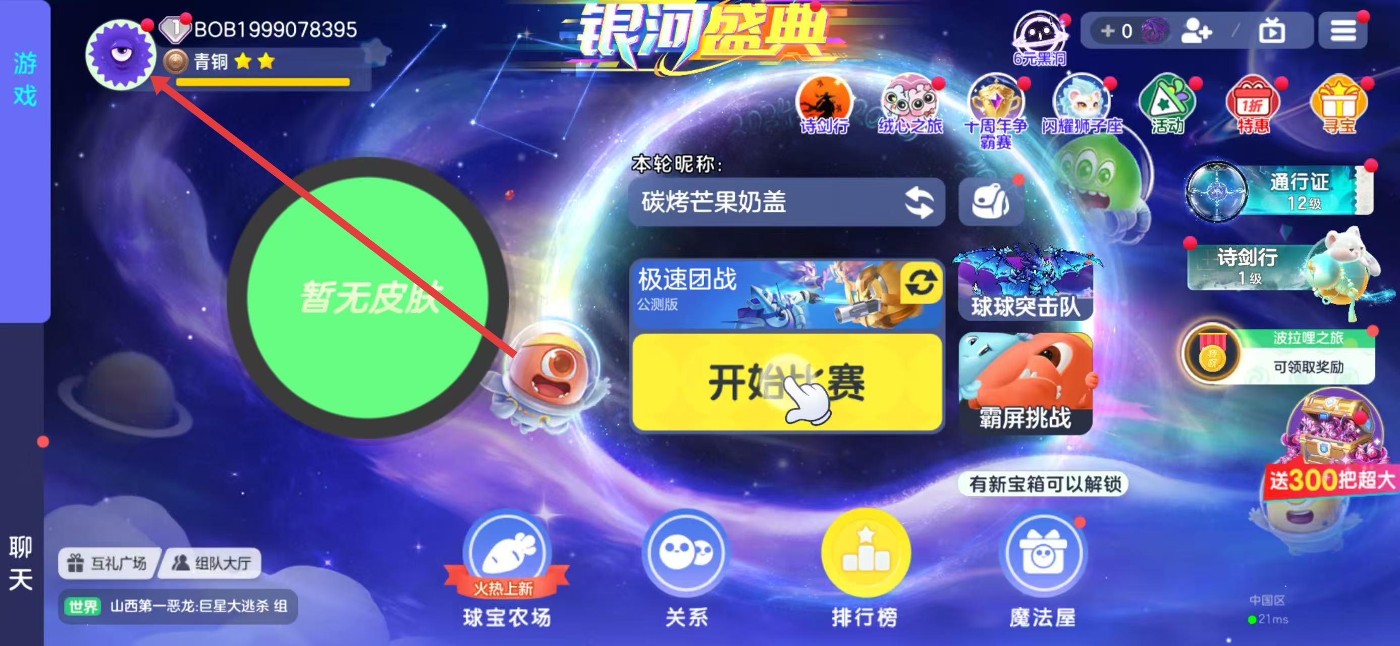 1、进入球球大作战游戏主界面,点击左上角带有紫色齿轮标志的头像,进入个人信息页面。