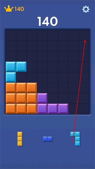 2、分数达到140皇冠数量140时,选择右侧蓝色方块向上移动,放置在顶部蓝色方块旁使同色相连。