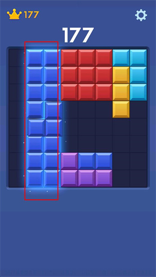 3、分数177皇冠177时,观察左侧红色方框内蓝色方块,移动对应方块使其连成完整区域实现消除。