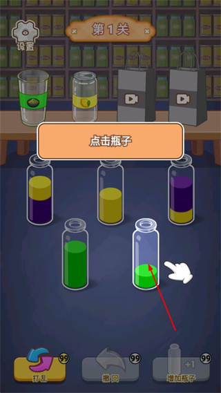 1、点击装有绿色液体的瓶子,将绿色液体倒入空瓶,使空瓶中绿色液体逐渐装满。