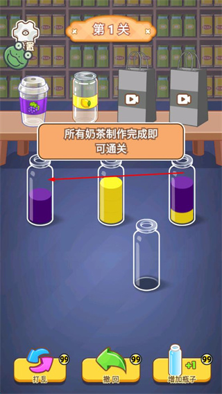 4、所有奶茶杯制作完成后,点击下一关按钮,即可通关进入下一关。