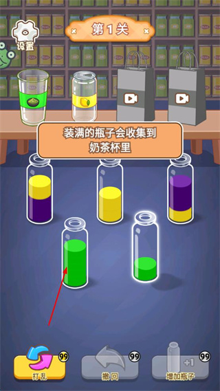2、点击装满绿色液体的瓶子,该瓶子的绿色液体被收集到对应的奶茶杯中。