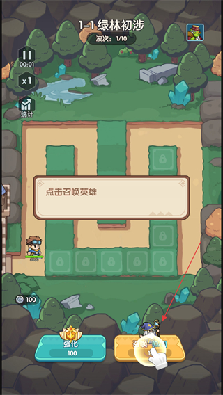 1、点击界面下方召唤英雄按钮可召唤英雄,召唤存在时间间隔,需根据怪物波次节奏合理召唤以布局防御。