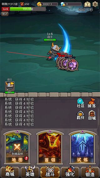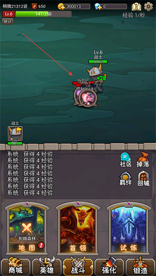 2、战士自动攻击怪物,每次攻击可获得经验如+28,积累经验提升等级。